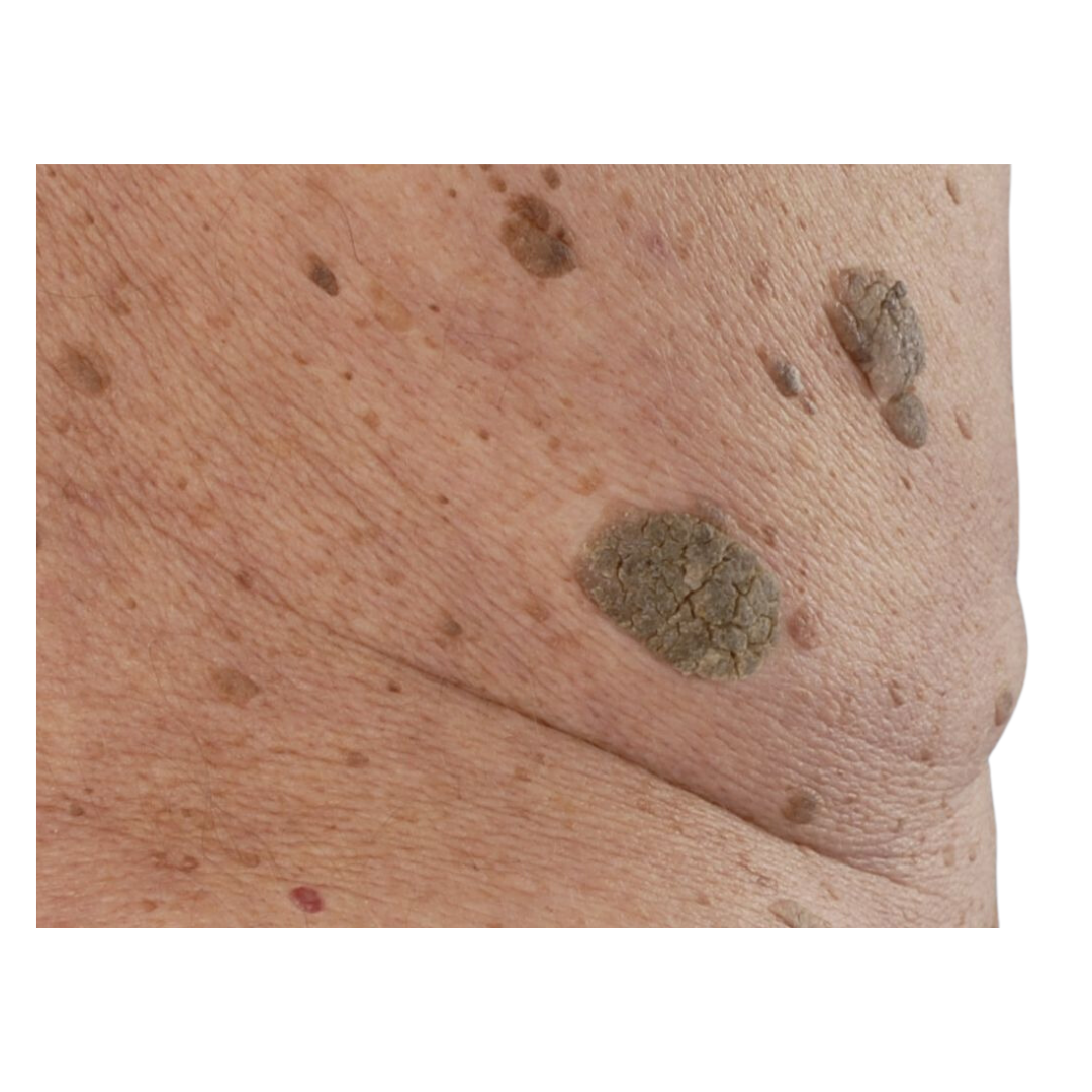 Ouderdomswratten, ook bekend als verrucae seborrhoicae, zijn goedaardige, vlakke, ronde huidplekken die variëren van geel tot donkerbruin. Ze ontstaan door een versnelde celdeling van de oppervlakkige huidcellen en komen meestal voor op volwassen leeftijd. Deze wratjes kunnen geleidelijk in aantal toenemen en verschijnen voornamelijk op de romp en in het gezicht, waar ze soms als cosmetisch storend worden ervaren.